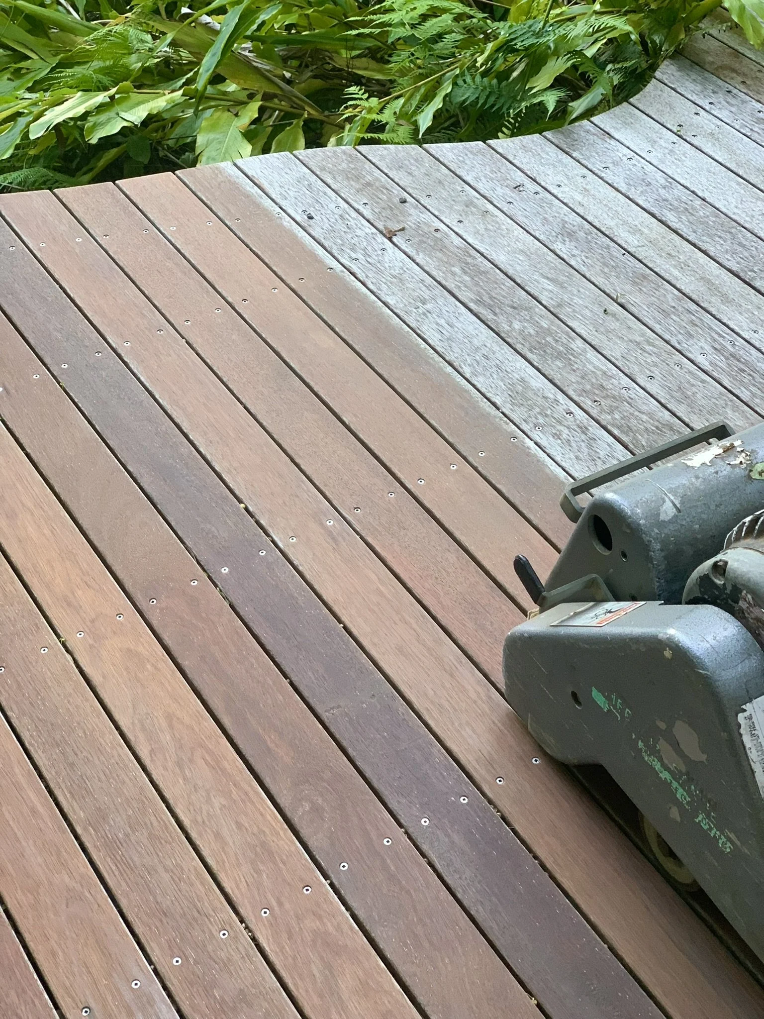I use a patented Aussie DeckSand system which utilises an abrasive brush, rather than traditional sand paper to quickly and effectively remove surface material without damaging screw heads, eating away your deck or creating mounds of dust.